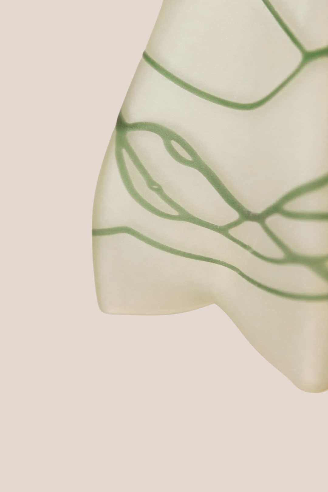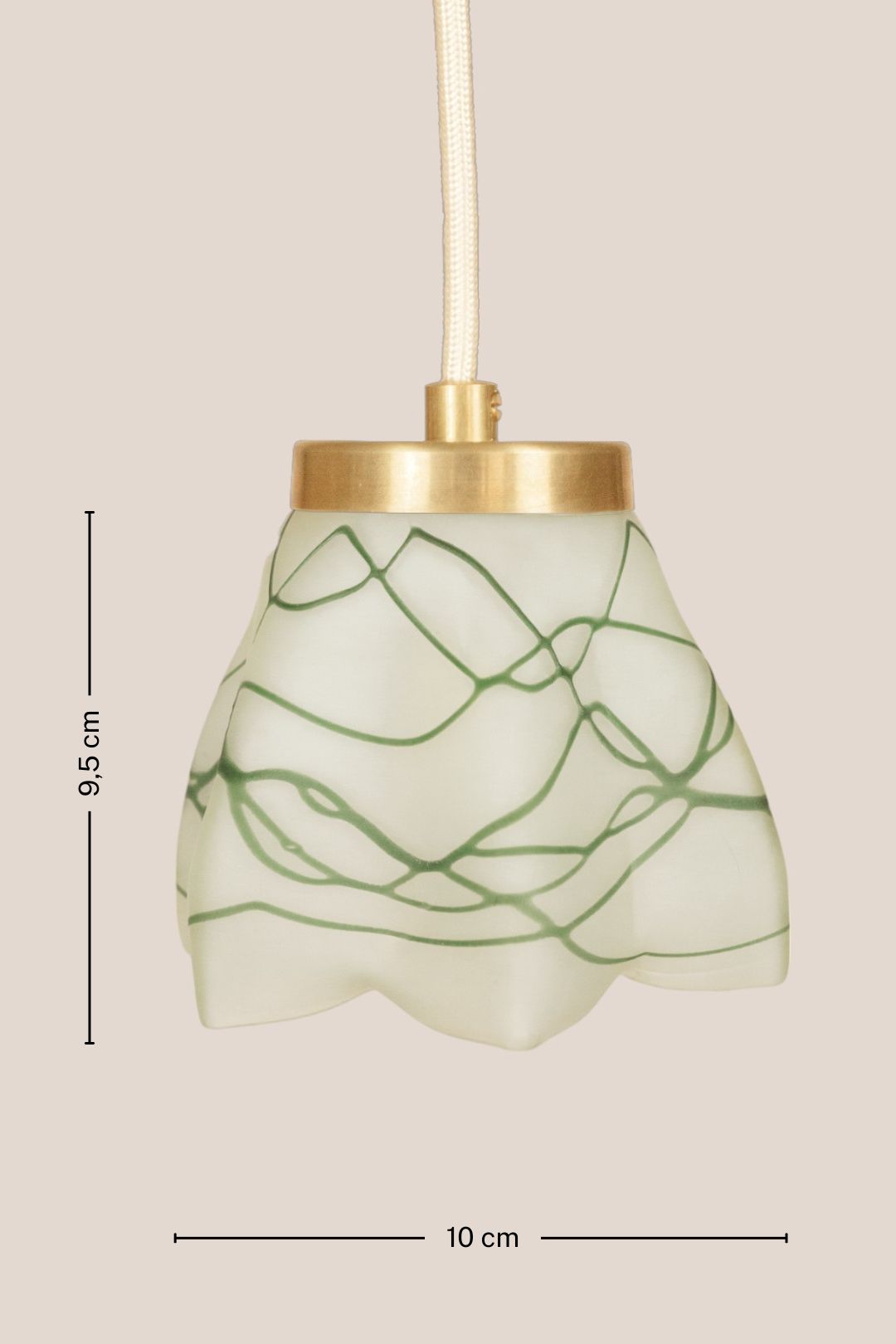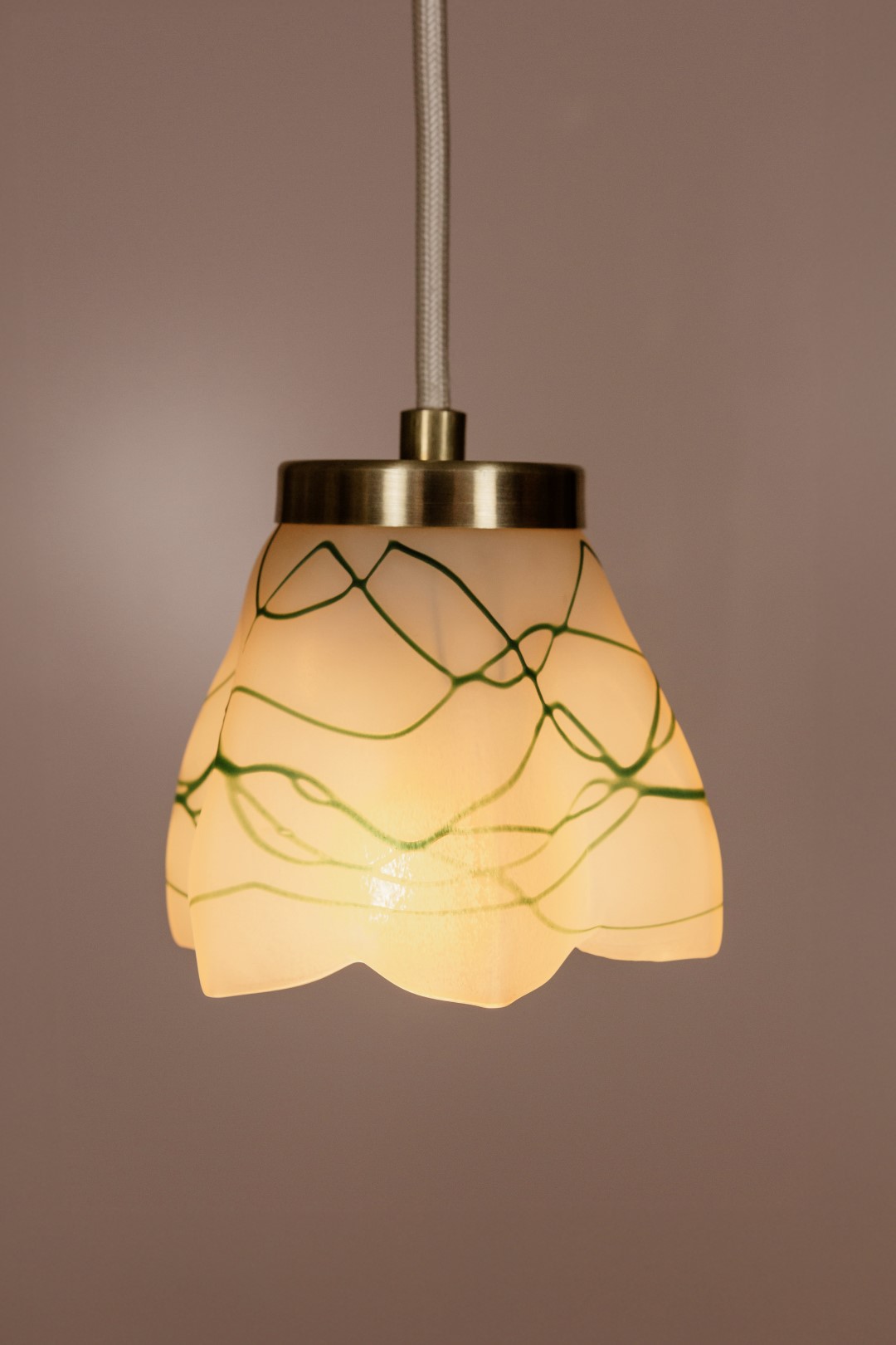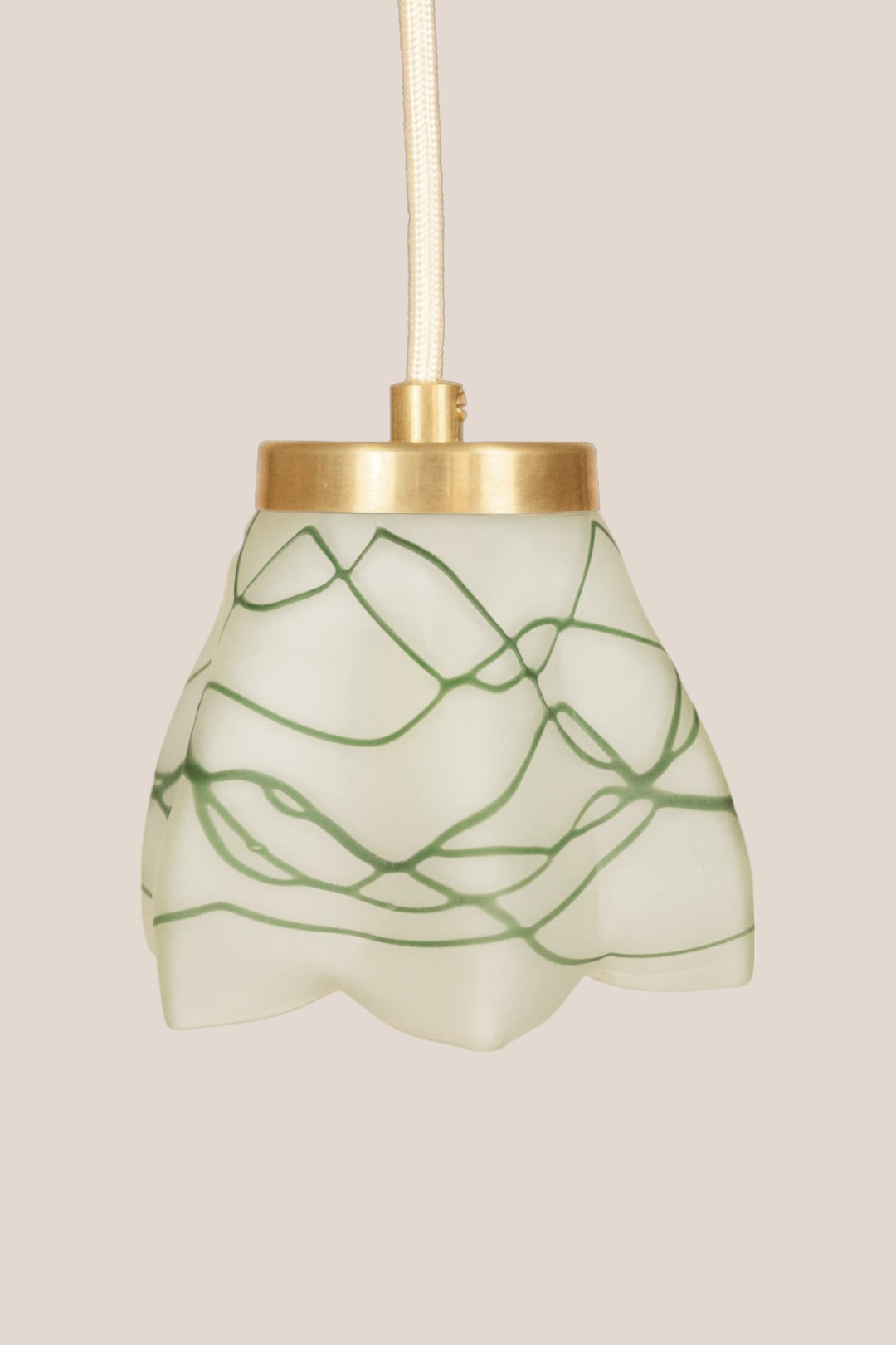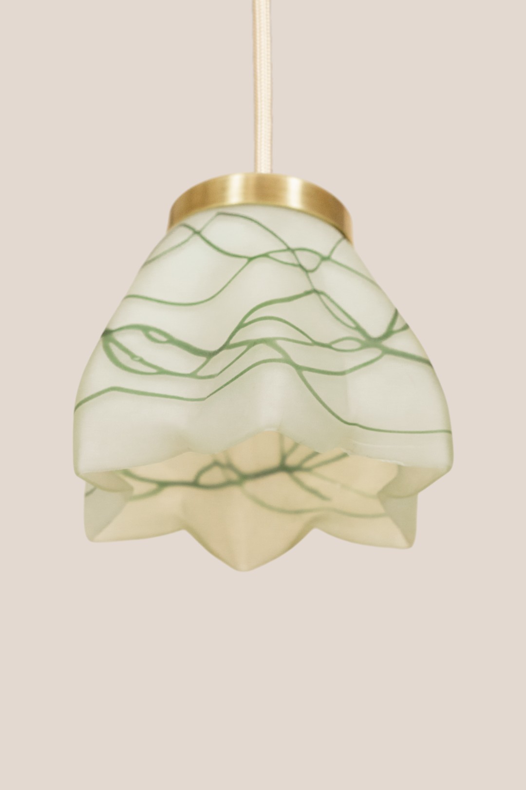 Ceiling pendant light with delicately intertwined green lines on frosted glass.